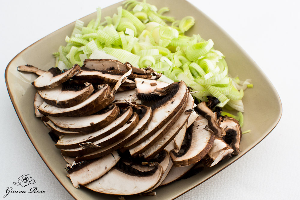 Saute sliced leeks and mushrooms (I used one big portobello here) in a little butter and olive oil.